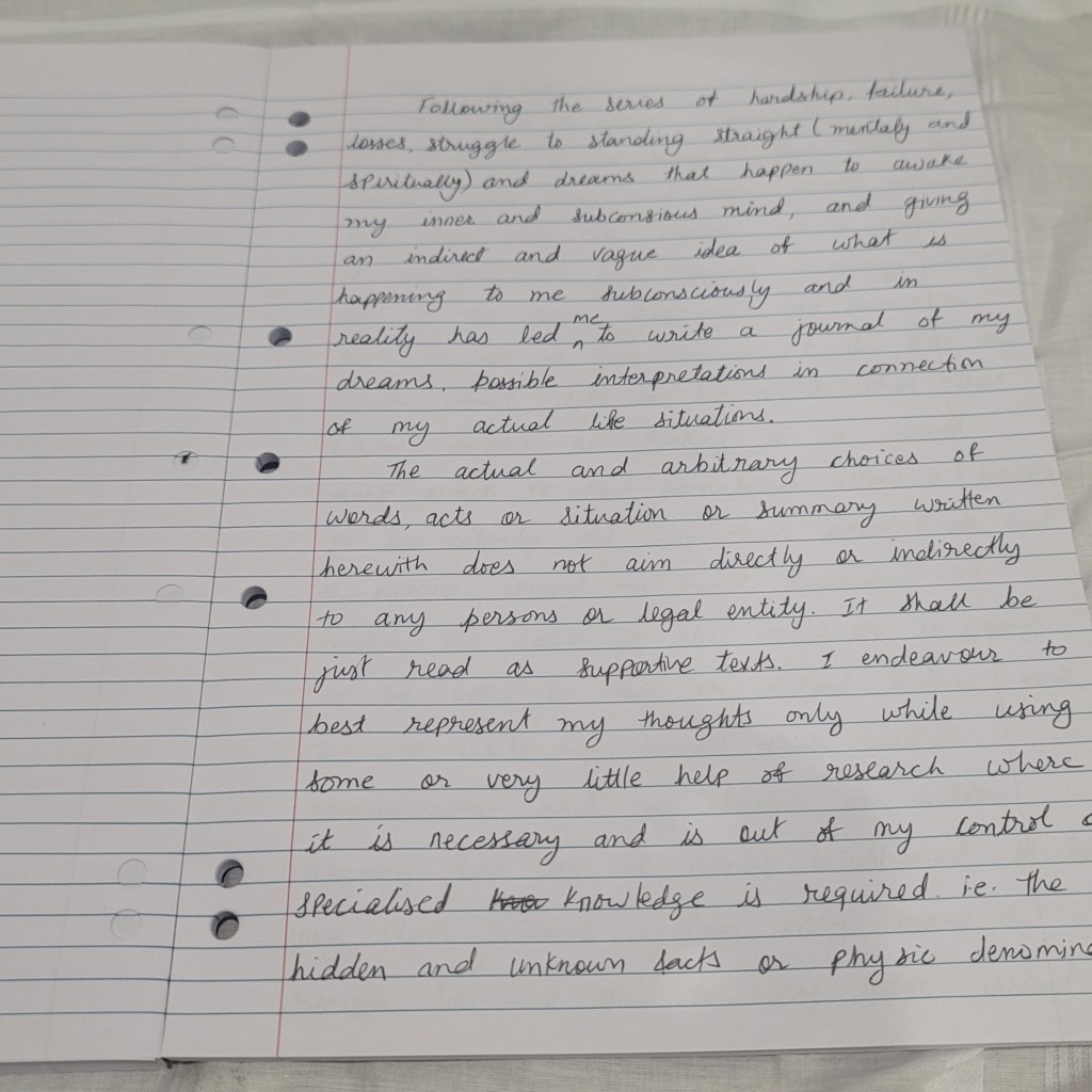 The boundaries between the subconscious and conscious blurred, urging me to document not just what I saw, but what I felt. That was the birth of this handwritten piece: “Journal of Dreams, Interpretation and Spirituality.”🧠 It is not about right or wrong interpretations, but a raw, unfiltered dive into how dreams can reflect real-life situations.📖 It is not a research paper. It’s a reflection. An offering. A journey.🧘♂️ It doesn’t aim to name or blame—it aims to heal and make sense of the inexplicable. I write this journal with minimal research, using dreams as keys to unlock my thoughts. When the world fails to offer clarity, I believe our inner world still does.