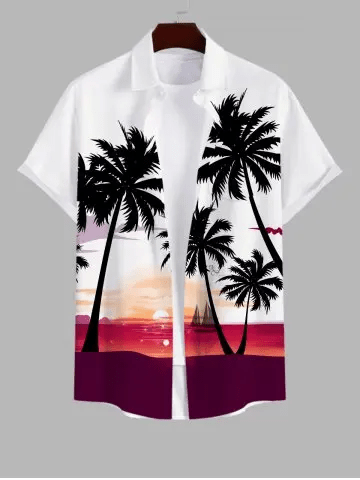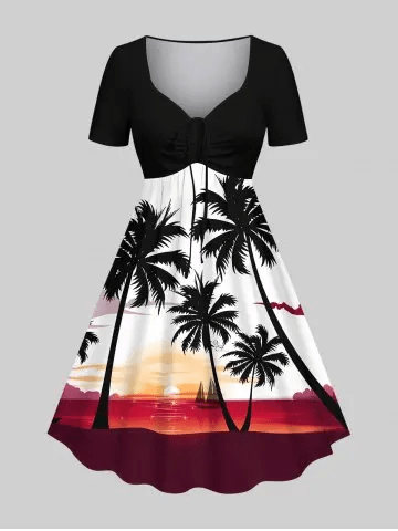 Coconut Tree Sunset Sailboat Colorblock Print Plus Size Matching Hawaii Beach Outfit For Couples only $39.99